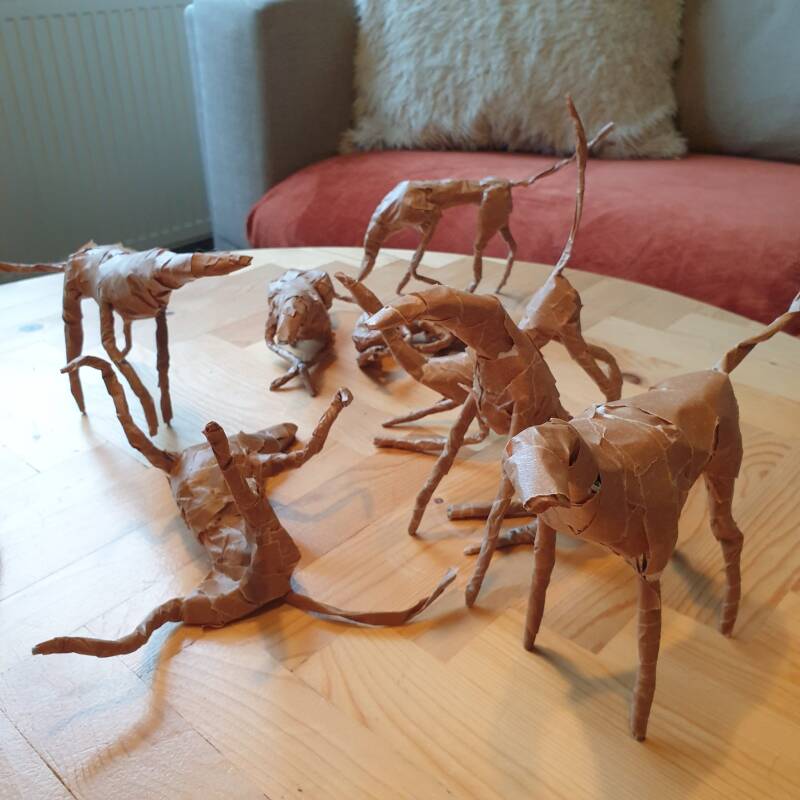 De sliertenhondjes, voordat ze voorzien werden van een laag papier-maché. Het begint bij mij allemaal met stukken krantenpapier en een rol bruine tape. Van daar uit kan ik de leukste vormen en figuurtjes maken.